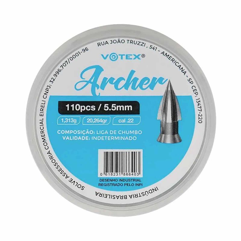 O Chumbinho Archer da Votex de calibre 5,5mm (.22) é um modelo com design de saia curta e cabeça extremamente pontuda e alongada. É ideal para tiros perfurantes e com destruição a curtas e médias distâncias.