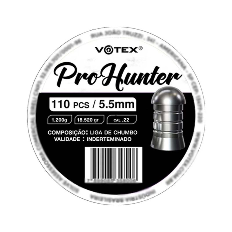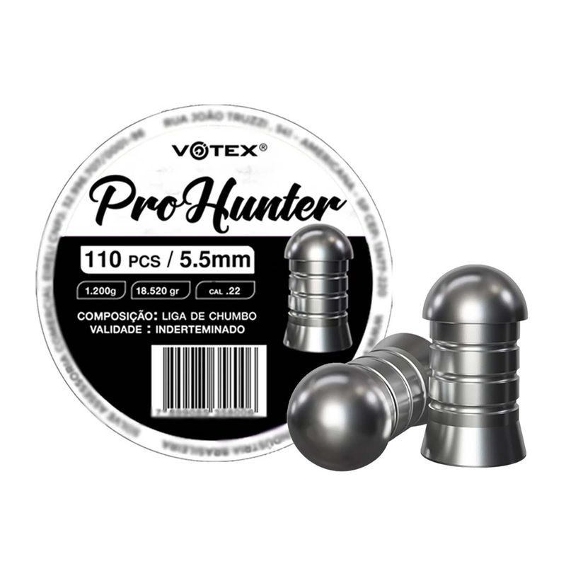 O Chumbinho Pro Hunter da Votex de calibre 5,5mm (.22) é um modelo de cabeça arredonda,  projetado para fornecer uma energia consistente e precisa, garantindo desempenho de alto nível em caçadas.