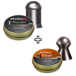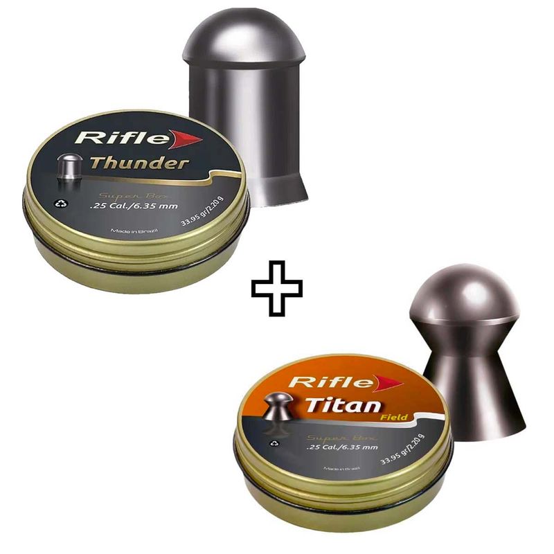 O kit de chumbinho rifle calibre .25 (6,35 mm) é composto por 150 chumbinhos Titan e 150 chumbinhos Thunder, totalizando duas latas com 300 chumbinhos total.