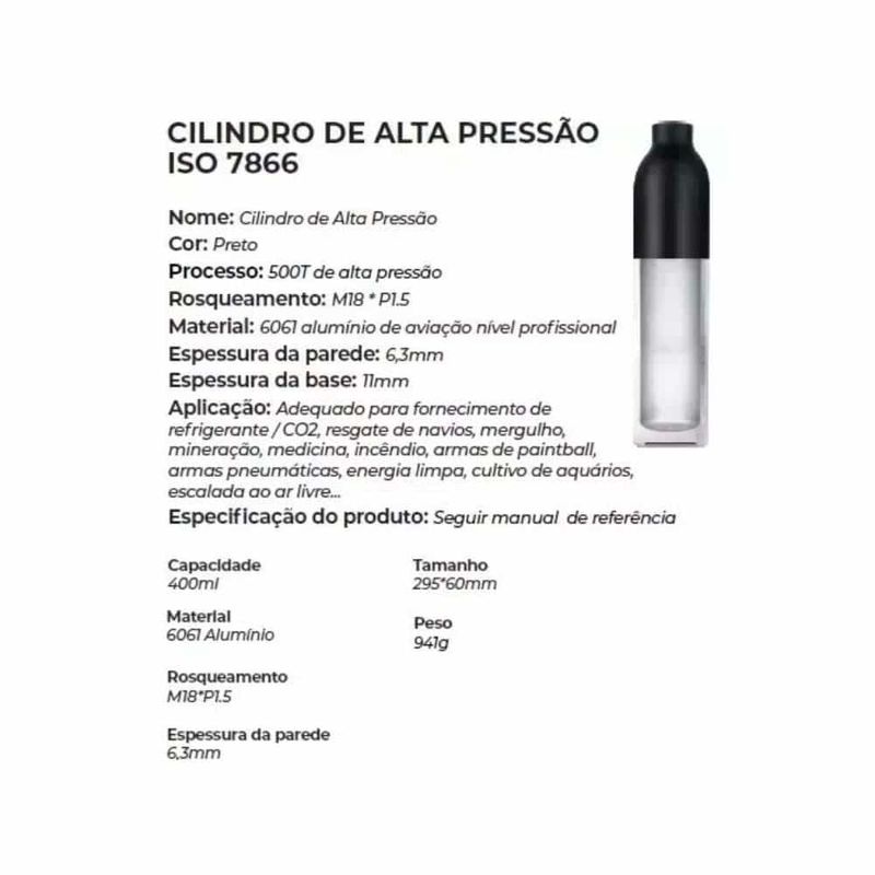 Com uma impressionante capacidade de 0,40 litros e operando a 4500 psi, este cilindro garante um desempenho excepcional e uma precisão de tiro inigualável. Suas especificações notáveis incluem um diâmetro de 60 mm, uma espessura de parede de 6,3 mm e um comprimento de 290,5 mm. Além disso, seu design em liga de alumínio torna-o incrivelmente leve e fácil de manusear.
