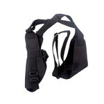 Fixação através de fitas reguláveis produzidas em nylon que se prendem ao redor dos dois braços, sendo transpassadas pelas costas
