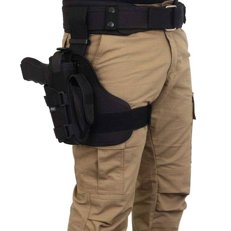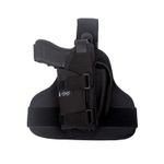 Produzido acabamento em Nylon super resistente, dispõe de um sistema prático de fitas de nylon reguláveis que se prendem ao redor do tornozelo através de fecho de contato. Ainda conta com botão de pressão de liberação rápida da arma.
