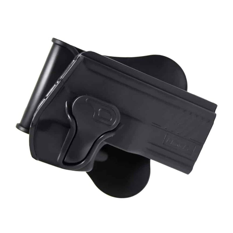 Com um ótimo mecanismo de segurança o Coldre Amomax possui botão de liberação pelo dedo indicador e bloqueio rápido que permite a remoção rápida e bloqueio automático quando a arma é coldreada