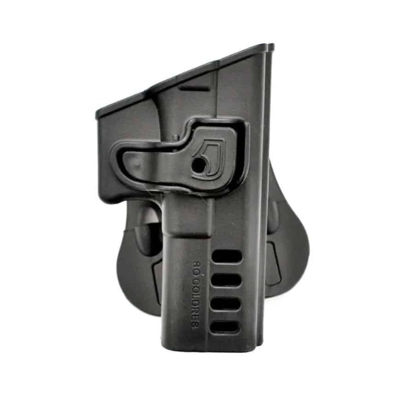 O Coldre da Só Coldres possui saque suave com trava passiva de liberação, assim pode ser ter a pistola acoplada de forma simples.