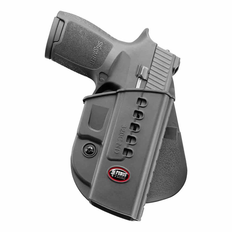 O modelo Fobus 320C ND conta com sistema Paddle, no qual a aba lateral do coldre é fixada na cintura. É compatível com pistola Sig Sauer P320 Full Size e Compact (todos os calibres), P320 X-Carry, P250 Compact, Taurus TH9 e IWI Massada.