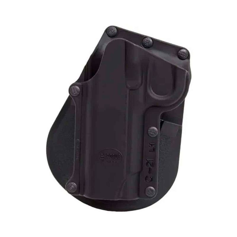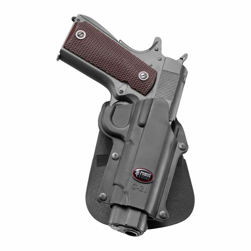 O modelo Fobus CH-21 conta com sistema Paddle, no qual a aba lateral do coldre é fixada na cintura. É compatível com pistola Colt 1911 sem trilho de 7 e 9 tiros.