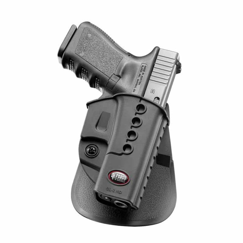O modelo Fobus GL-2ND conta com sistema Paddle, no qual a aba lateral do coldre é fixada na cintura. É compatível com pistola Glock 22 e 23 até quarta geração e  Glock 19, 19X, 17, 25, 45, 44, 31 ,32, 34 e 35 de todas as gerações.