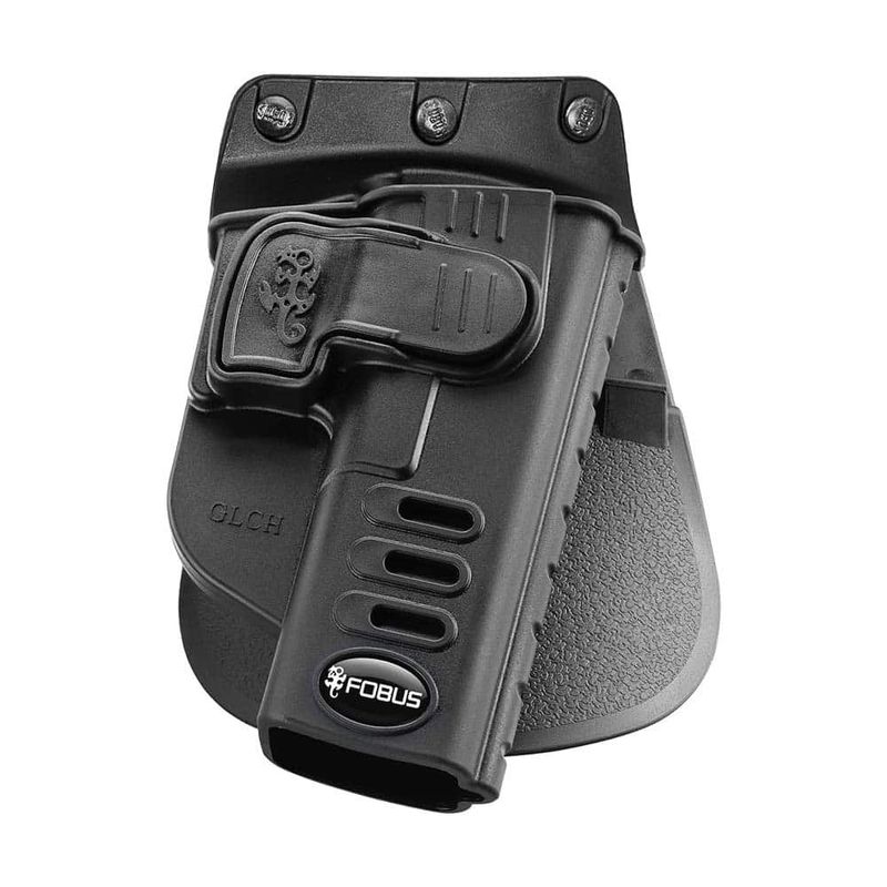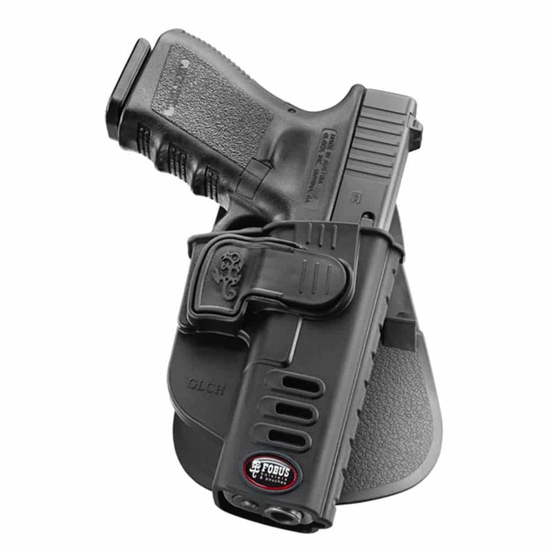 O modelo Fobus GLCH conta com sistema Paddle, no qual a aba lateral do coldre é fixada na cintura. É compatível com pistola Glock 22 e 23 até quarta geração e Glock 17, 19, 19X, 45, 25, 31, 32, 34 e 35 de todas as gerações.