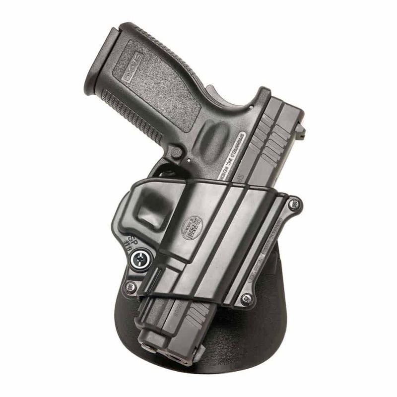 O modelo Fobus SP-11B conta com sistema Paddle rotativo, no qual a aba lateral do coldre é fixada na cintura. É compatível com pistolas Springfield XD e XDM e Taurus PT640, 609, Millennium e Pro 24/7.