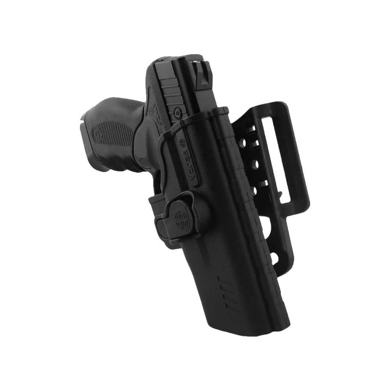 Possui trava de segurança, que pode ser liberada no exato momento do saque da arma.