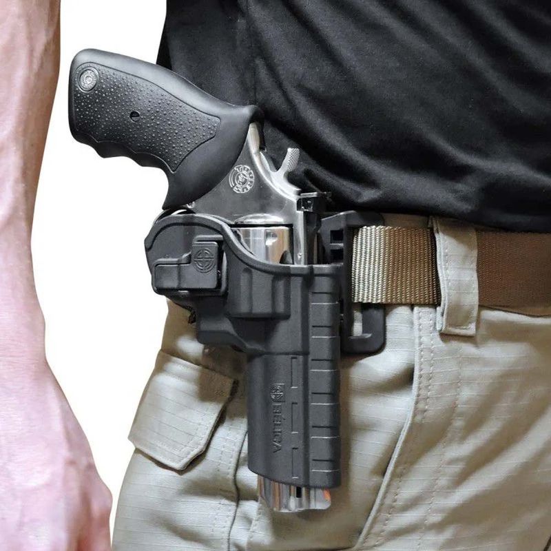 Conta com uma catraca rotativa que permite a rotação do coldre, facilitando o manuseio da seu revólver. Você pode fixar o seu coldre em outras plataforma compatíveis com a catraca.