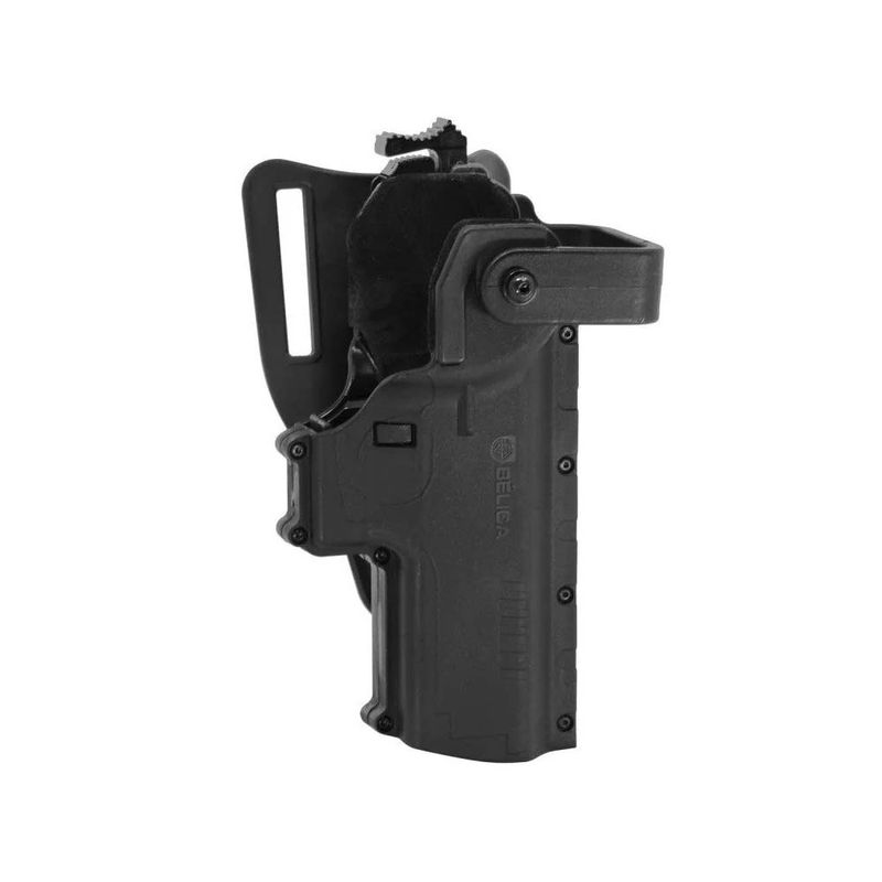 O coldre possui dual lock system que evita o destravamento indevido e proporciona muito mais proteção e eficiência e possui uma trava de segurança, que pode ser liberada no saque da pistola.