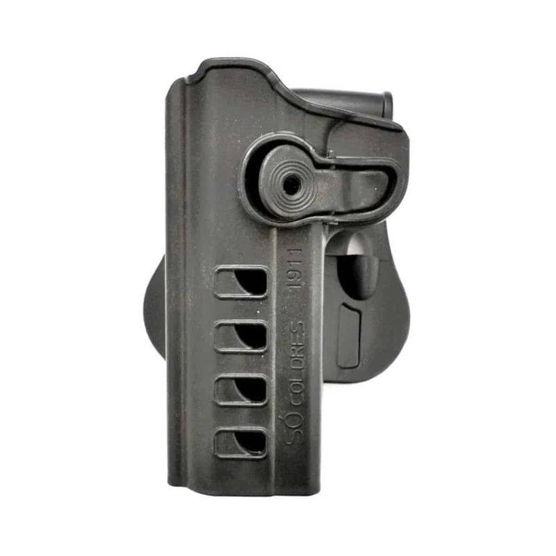 O Coldre da Só Coldres possui saque suave com trava passiva de liberação, assim pode ser ter a pistola acoplada de forma simples.