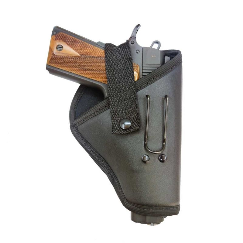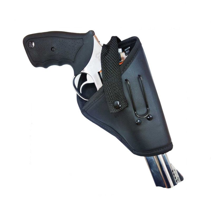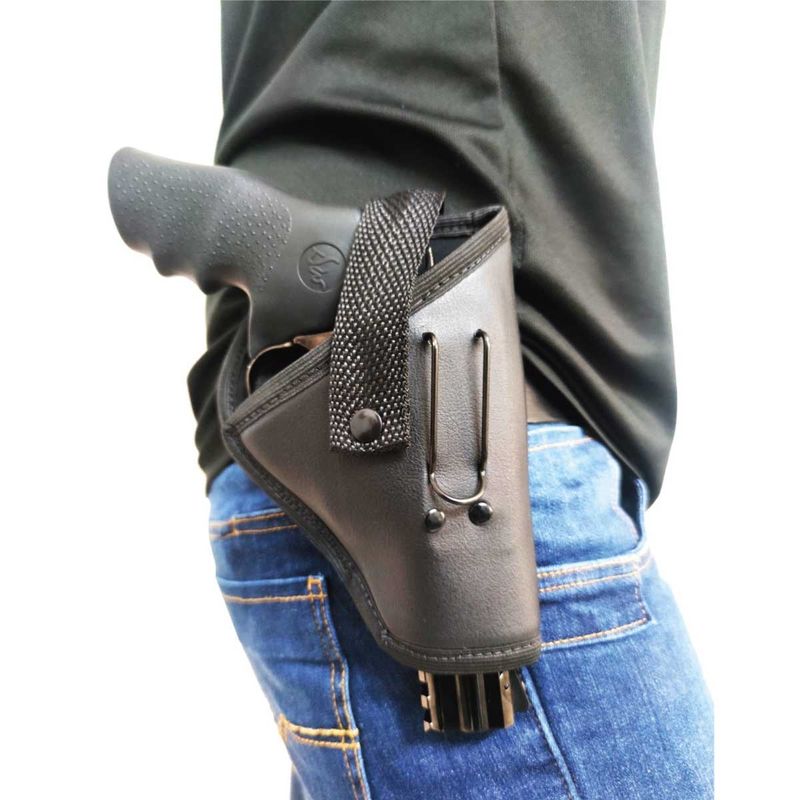 O coldre universal possui 3 camadas, sendo a parte interna em Neoprene, que não arranha ou danifica a pistola, forro interno de proteção e acabamento em couro sintético preto.