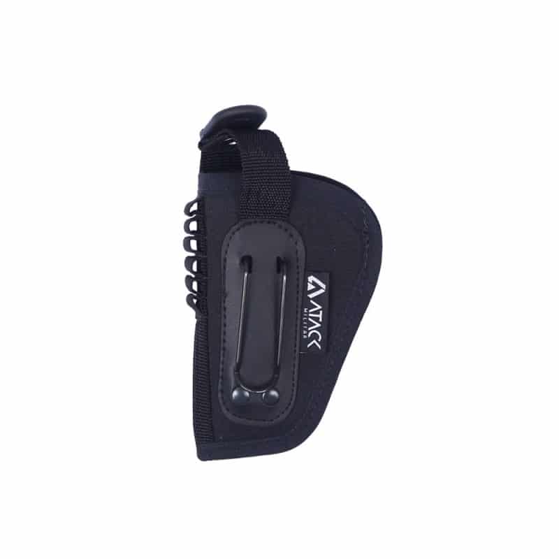Desenvolvido em triplo tecido: cordoba, E.V.A e bora, entregando uma composição super resistente, maleável e de alta qualidade com revestimento que se molda a arma e, ao mesmo tempo, a protege contra o suor, sujeiras e arranhões para aumentar ainda mais a sua vida útil do seu equipamento. Para você ter ainda mais mobilidade, conta com clipe de metal flexível para seu uso com o coldre interno com baleiro por dentro da vestimenta.