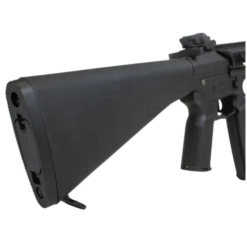 O design fixo proporciona um apoio firme e confortável no ombro, favorecendo o alinhamento da mira e uma postura mais estável durante o uso. Essa característica é fundamental para jogadores que priorizam precisão e controle, especialmente em funções de suporte ou tiro a média e longa distância dentro do airsoft.
