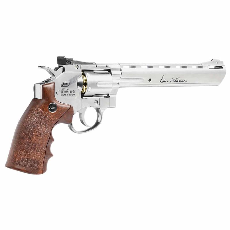 É impossível pensar em revólver airgun e não lembrar do clássico Revólver Dan Wesson 8" Cromado, da ASG.