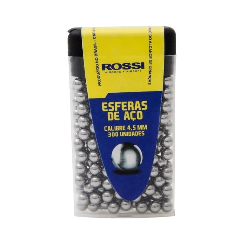 Esferas de aço Rossi no calibre 4,5mm para armas com cano sem raias. Fabricadas em Aço com alta densidade, contam com uma excelente resistência à oxidação e ação do tempo. Super fácil de transportar, elas acompanham uma caixinha de armazenamento e não ocupam espaço.