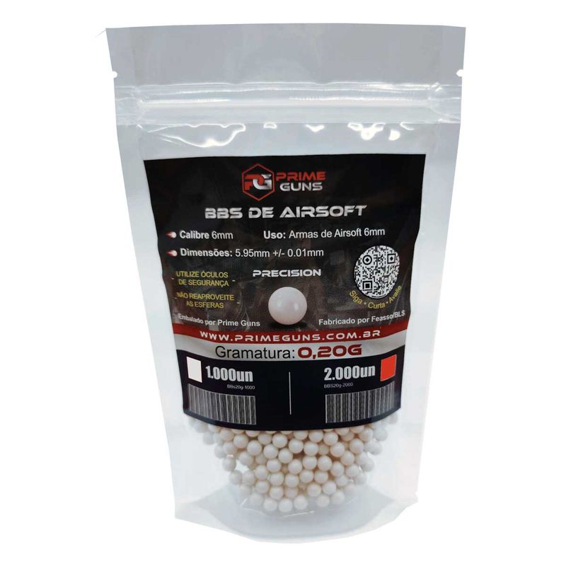 Extremamente polidas, as Prime Guns pesam 0,20g cada e possuem diâmetro de 5,95mm, com variação máxima de 0.01mm, diminuindo o risco de entupimento das esferas no cano e aumentando a precisão e são indicadas para armas de airsoft (AEG, AEP e GBB) com velocidade entre 200 e 380fps com essa gramatura de BB.