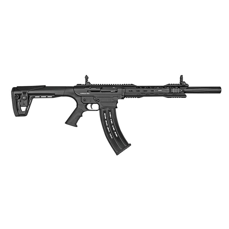 O handguard com M-LOK e trilhos Picatinny de 22 mm permite a instalação de lanternas, miras holográficas, alças, grips e demais acessórios — tornando a Copolla TR-12 um chassi altamente customizável. A coronha retrátil em polímero reduz o comprimento total para transporte e manobra em ambientes confinados, além de oferecer durabilidade e leveza, mantendo o peso total numa faixa prática de aprox. 4 kg.