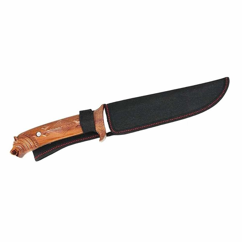 Sua empunhadura em madeira Rosewood é cuidadosamente trabalhada com recartilhados detalhados, oferecendo uma pegada confortável e segura, mesmo em condições adversas. O pomo, em forma de um leão rugindo, simboliza força e poder, destacando-se como um dos detalhes mais impressionantes desta faca. Além disso, tanto o pomo quanto aguarda-mão são inteiriços às talas da empunhadura, garantindo máxima durabilidade e firmeza durante o uso.