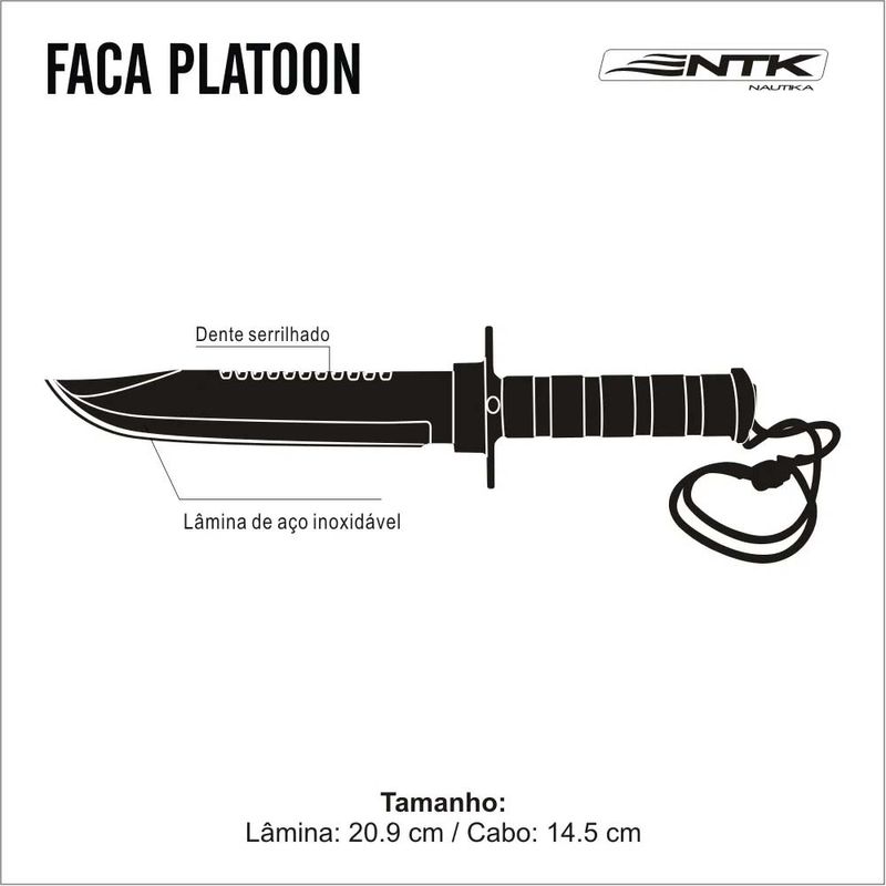 Ideal para circunstâncias de sobrevivência, resgate, caça e pesca, a faca Platoon tem na parte superior da lâmina um fio de serra, que ajuda em tarefas como corte de galhos. Seu cabo é de alumínio texturizado e com material antiderrapante, para um melhor manuseio e segurança na pegada.