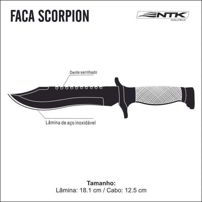 A lâmina é do tipo turca e com dois tipos de fio: um pontiagudo, para perfurações, e outro com serrilhado, para facilitar trabalhos que exijam serralheria. O cabo da faca Scorpion é texturizado e emborrachado, o que facilita o manuseio e dá firmeza ao segurá-la e utilizá-la. O cabo também possui um furo para passar cordão.