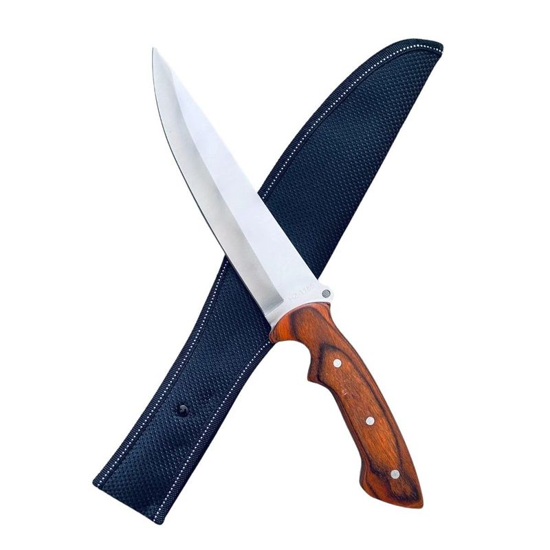 O cabo em madeira envernizada oferece pegada firme, visual elegante e boa ergonomia, além de excelente durabilidade quando bem conservado. Para transporte seguro, a faca acompanha bainha, facilitando o acondicionamento e o acesso durante o uso em campo.