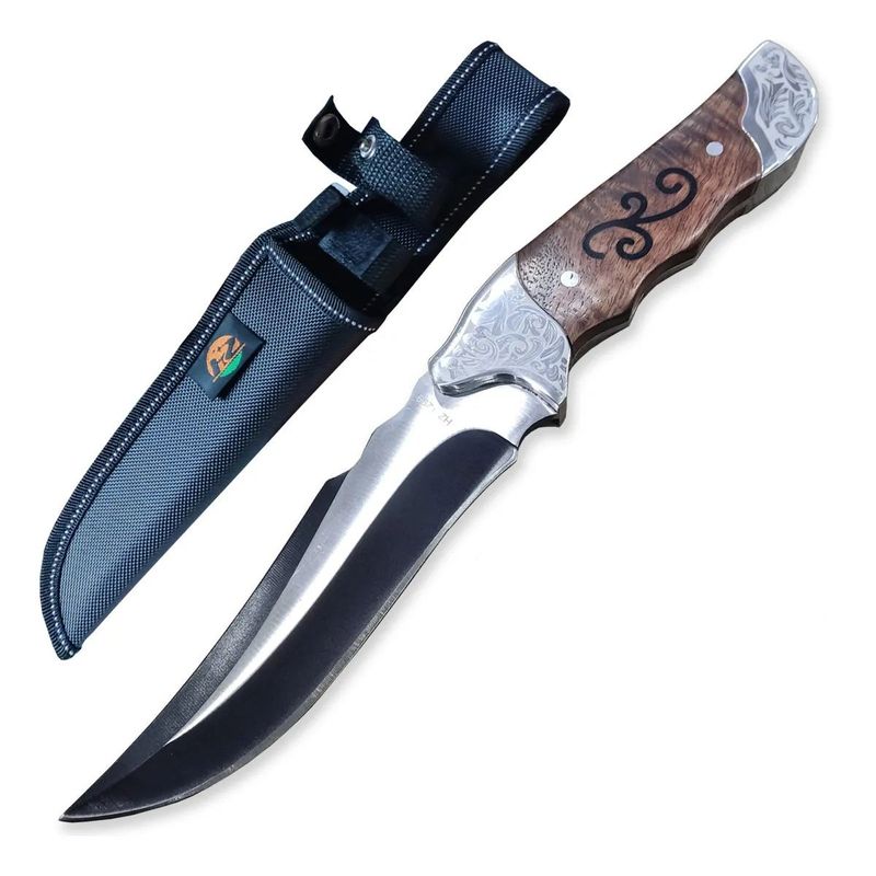 • Características: Lâmina em aço inoxidável 440, fio liso, cabo em madeira envernizada, estrutura Full Tang, bainha de nylon.