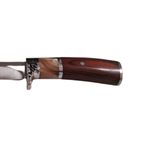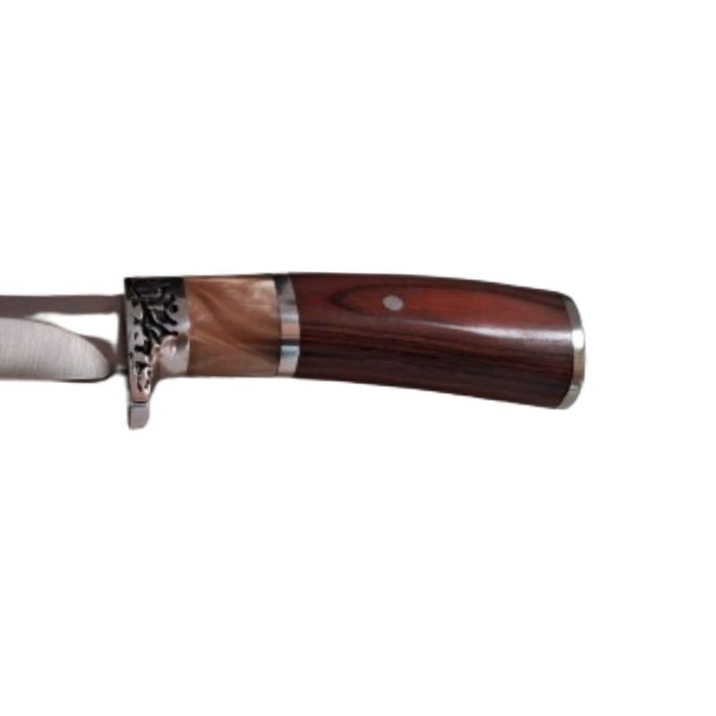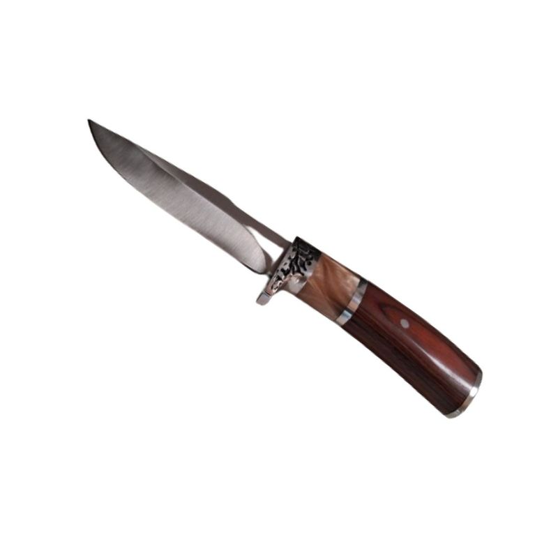 • Características: Lâmina em aço inoxidável, fio liso, cabo em madeira, bainha de nylon, lâmina fixa.