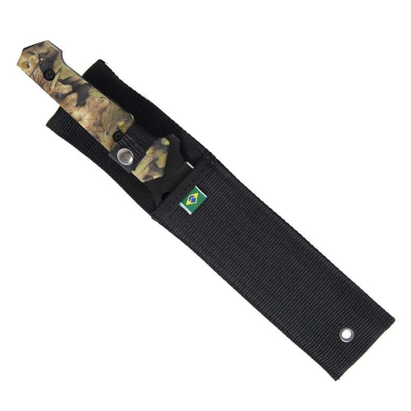 Para facilitar o transporte e a organização dentro de caixas e malas, a faca inclui um estojo de transporte com passador de cinto, o que facilita o manuseio.