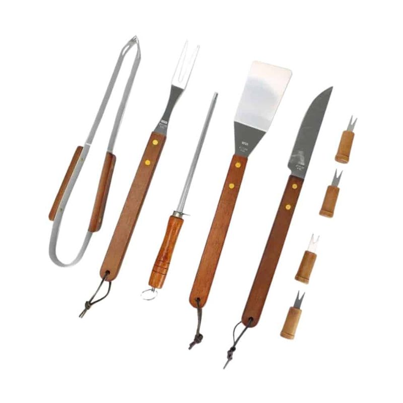 Possui: 1 Bolsa preta de nylon 1 Pegador para carne 1 Garfo para churrasco 1 Espátula multiuso 1 Faca de corte 1 Amolador de lâminas 4 Pegadores de petiscos