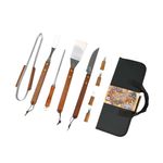 Todos os utensílios (exceto a bolsa) são confeccionados emaço inoxidável com acabamento em madeira, proporcionando resistência e sofisticação.