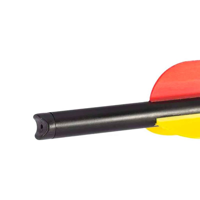 As flechas apresentam um corpo robusto em alumínio, garantindo durabilidade e resistência. Os nocks (encaixes) são feitos de plástico de alta qualidade para uma performance confiável.