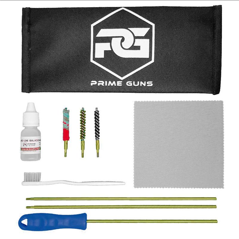O Kit de limpeza Prime Guns para armas de pressão 5,5mm é ideal para a limpeza e manutenção periódica de Carabinas, pistola e revólveres de chumbinho no calibre 5,5mm .22.