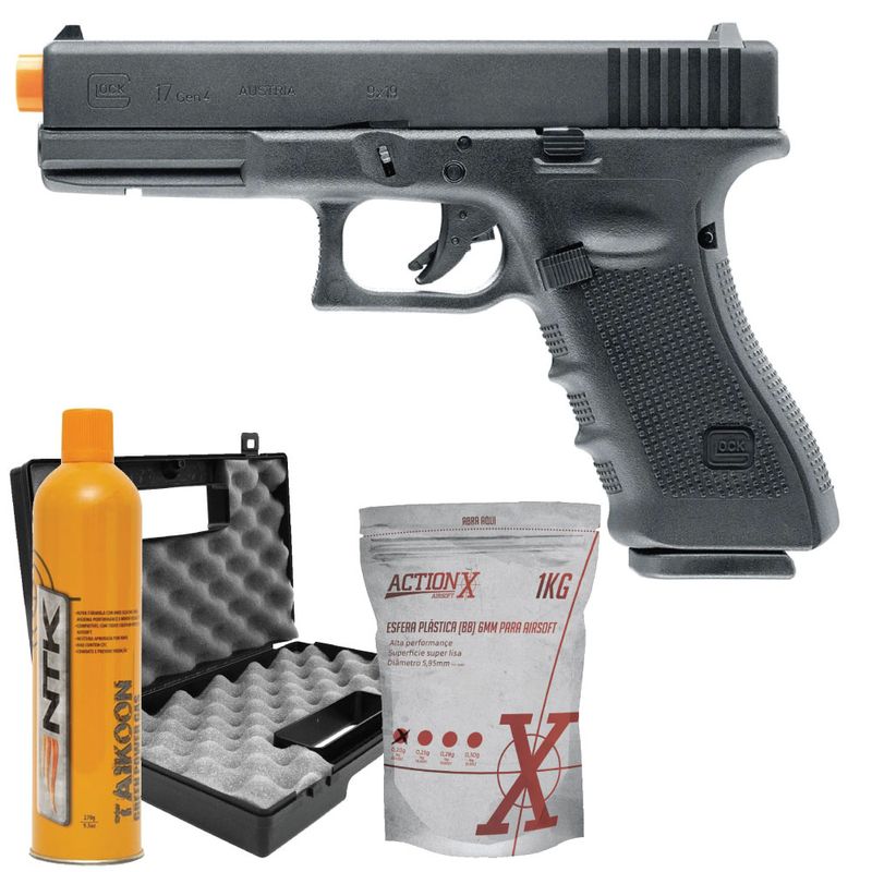 Esta Kit Pistola Airsoft Glock G17 Gen4 GBB Blowback Umarex 6mm dispara no modo Semi Automática com velocidade de 370fps - 113m/s e energia de 1 Joules Ver mais