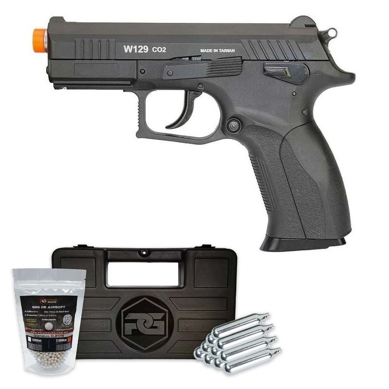 A W129 dispara BBs de 6mm a uma velocidade de 385fps com um cilindro de CO2 12g, ideal para tiro esportivo com realismo.