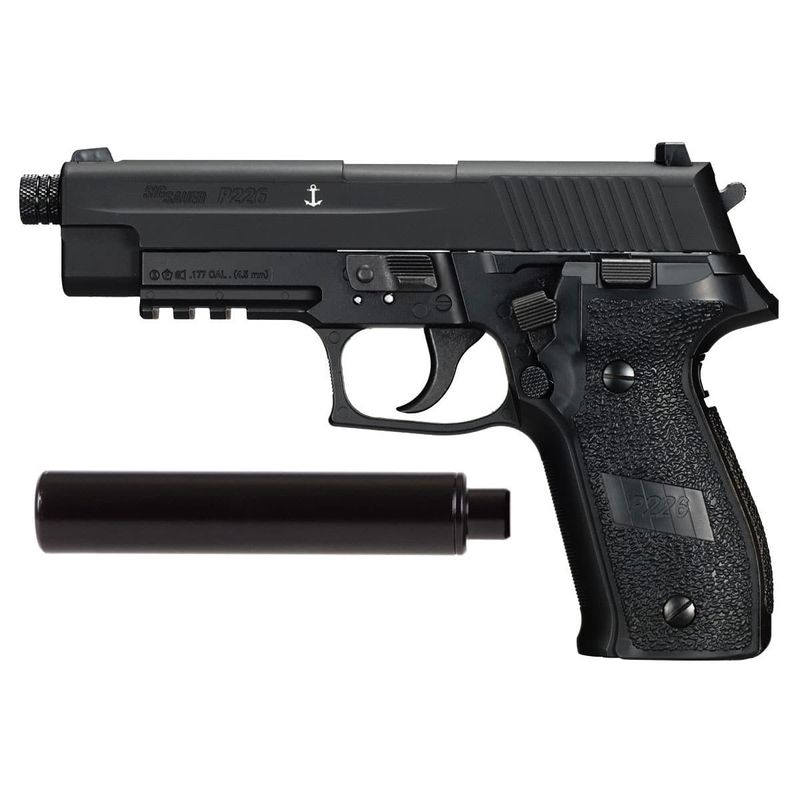 A pistola Sig Sauer P226 NAV é uma pistola airgun que dispara chumbinhos calibre 4,5mm, alimentada por CO2 12g.