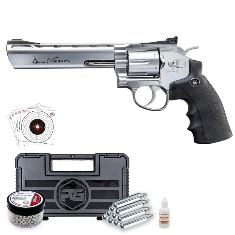 Esta Kit Revólver Dan Wesson 6" Cromado Co2 4,5mm Metal dispara no modo Repetição com velocidade de 420fps - 128m/s e energia de 2,5 Joules Ver mais