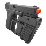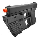 Feito em polímero de alta densidade, o Kit Vector para Glock é acoplado no trilho de 22mm frontal da Glock e permite que você utilize a pistola da forma convencional ou com o apoio das duas mãos, como uma Sub Metralhadora, além de ter um compartimento para acoplagem de um magazine extra.