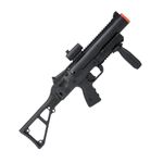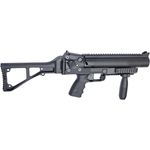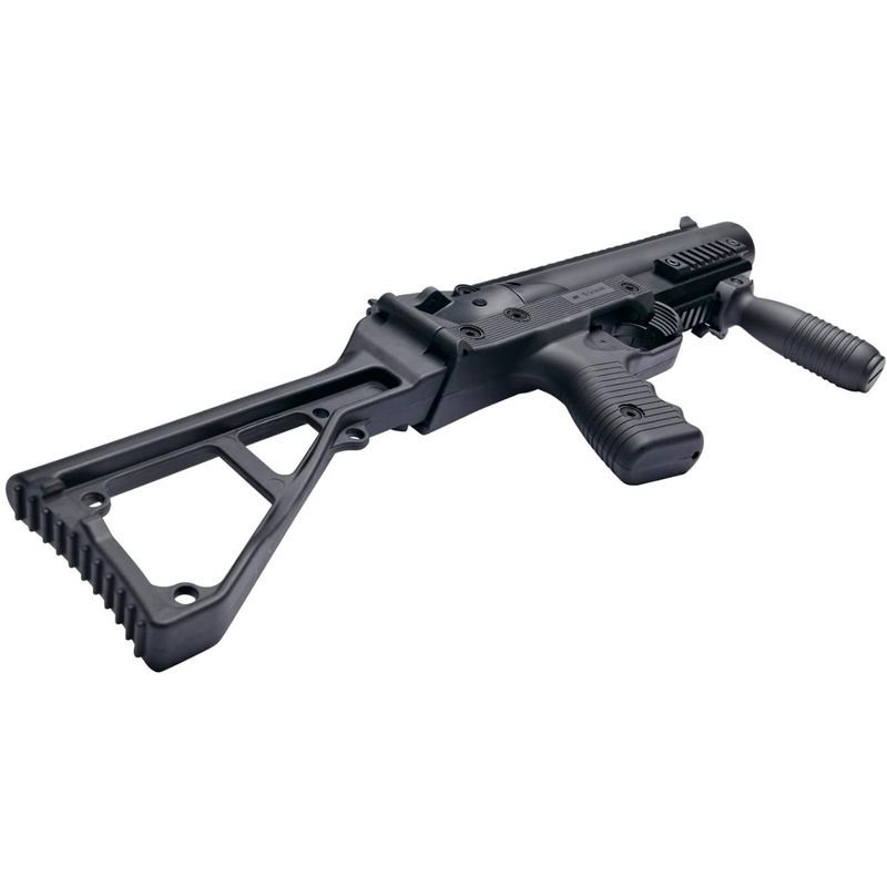 Possui coronha dobrável estilo H&K, foregrip removível, mira fixa integrada e suporte para bandoleira, oferecendo máxima versatilidade em campo.