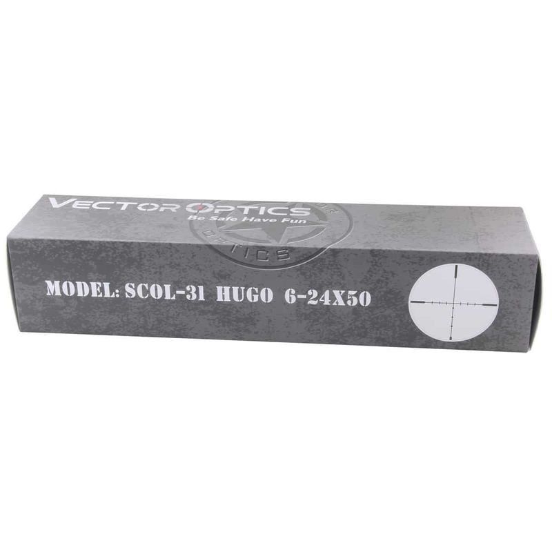 A Luneta para Carabinas e Rifles de Pressão 6-24X50 Vector Hugo 25,4mm SFP conta com lentes multi-revestida, foco lateral mínimo de 10 jardas, ampliação de zoom em 4x, encaixe do olho de 4", monotubo de 1" (25,4mm) feito de metal aeronáutico, Mount para trilho de 22mm, 1/4 MOA de ajuste por cada giro e bloqueio da torre e regulagem na faixa máxima de 600 jardas
