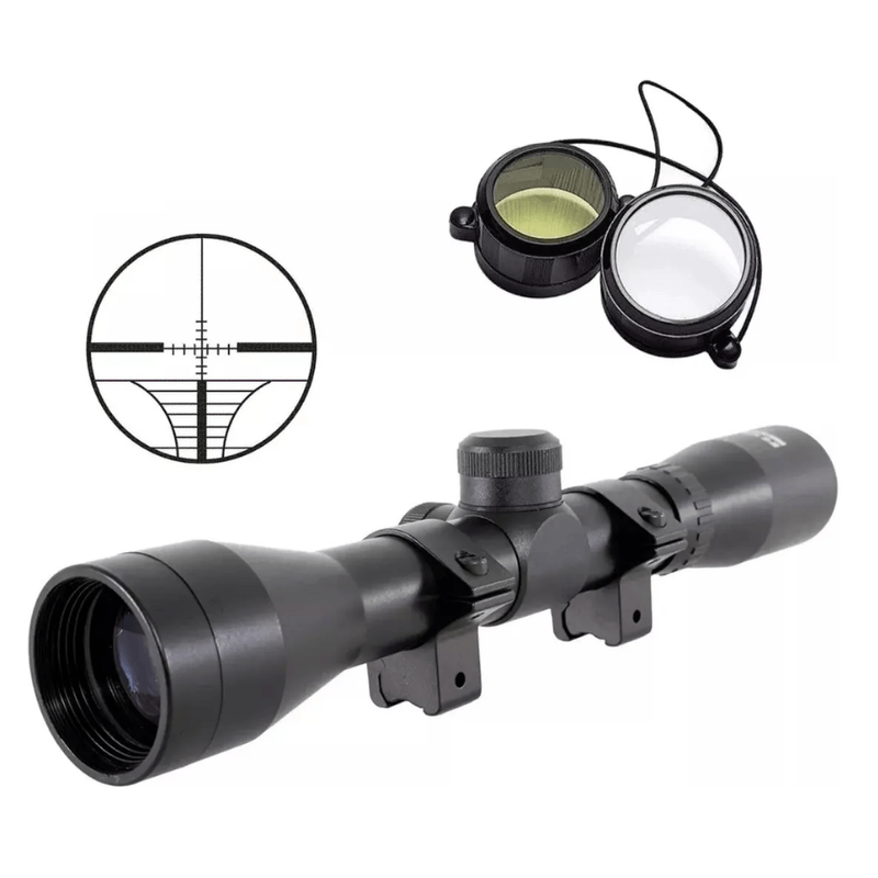 O retículo Mil-Dot permite compensação precisa para tiros em diferentes distâncias. O modelo acompanha mount bipartido de 22mm, reforçado com quatro pontos de aperto superior, ideal para trilhos padrão Picatinny/Weaver.