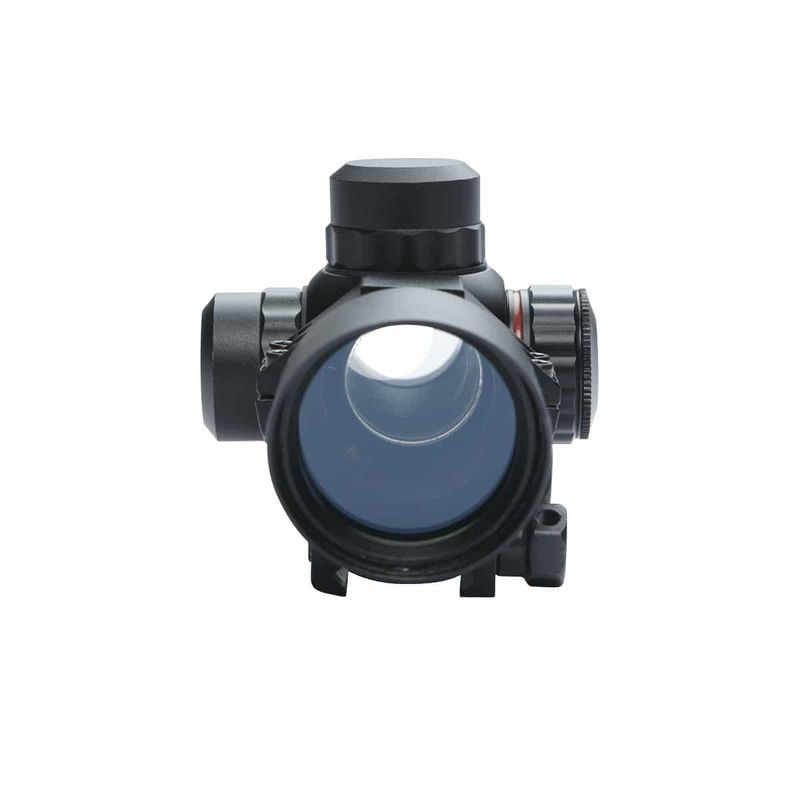 Viseira de ponto de 30mm de baixo perfil construída em alumínio anodizado com uma viseira solar que reduz o brilho para uma imagem nítida em condições de luz.