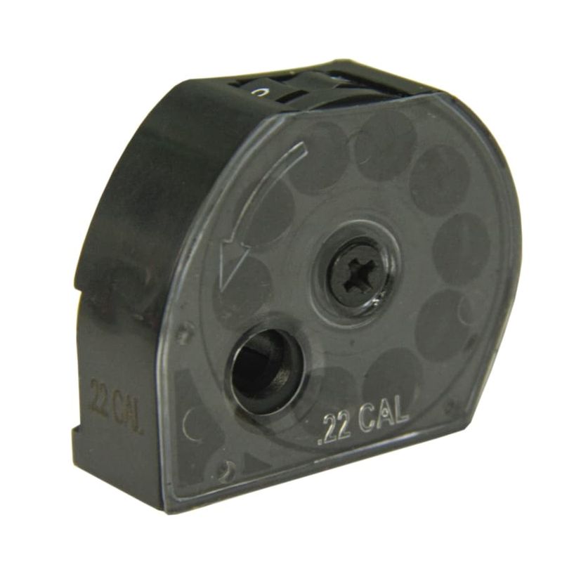 O magazine é próprio para os modelos de carabina Beeman 1338 PCP, e funciona através de um sistema de tambor rotativo com capacidade para 10 chumbinhos no calibre 5,5mm (.22).