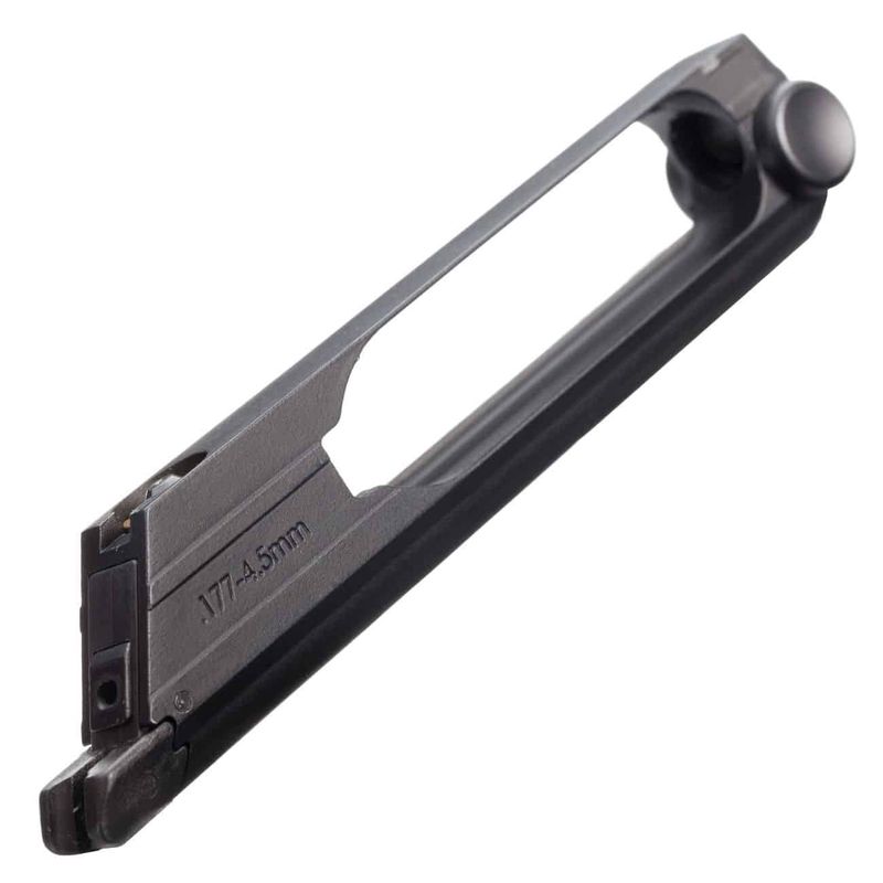 O magazine de substituição Legends para a pistola de pressão Luger P08 CO2 4,5 mm BB Blowback contém 20 esferas de aço redondas e pode ser rapidamente substituído na pistola de ar com a chave de montagem incluída.