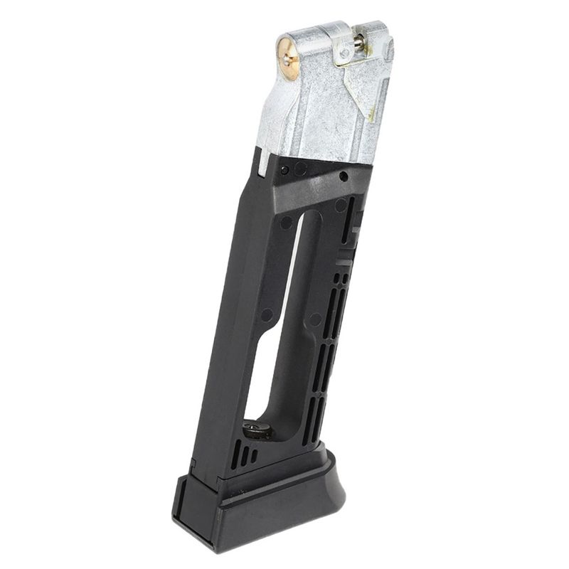 Com capacidade para 21 esferas de aço, este magazine de tamanho full size é construído em metal com partes em polímero de alta resistência, garantindo durabilidade e alimentação consistente das munições.