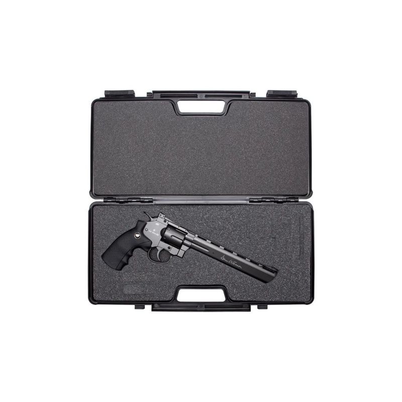 Com dimensões generosas de 46 x 23 x 8,5 cm, a caixa comporta perfeitamente revólveres Dan Wesson (modelos de 2,5", 4", 6" ou 8"), dois speedloaders, duas cápsulas de CO2 e outros acessórios essenciais. Seu interior conta com recortes de espuma de alta densidade, moldados especificamente para manter cada item firme e protegido, mesmo em deslocamentos mais longos.