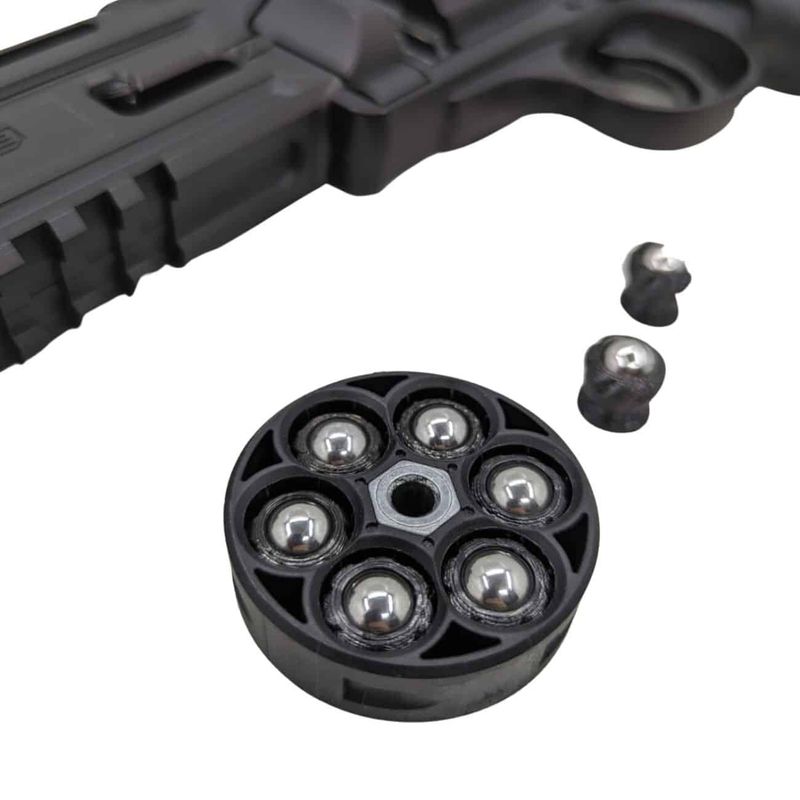 Uma munições que encaixa no tambor do revólver e atua como suporte das poderosas esferas de aço que ficam dentro da borracha de fixação.
