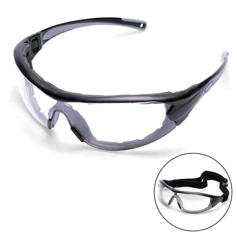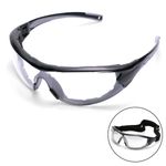 Óculos de segurança com lente de proteção em policarbonato com tratamento antirrisco, antiembaçante e UV, armação convencional com revestimento interno em borracha macia, hastes removíveis para colocação de elástico ajustável (incluso).